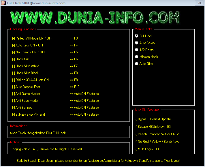 Cheat Audition Ayodance V6109 : Full Hack , Auto Sewa , 1/2 Dewa , Mission Hack , Auto Gitar